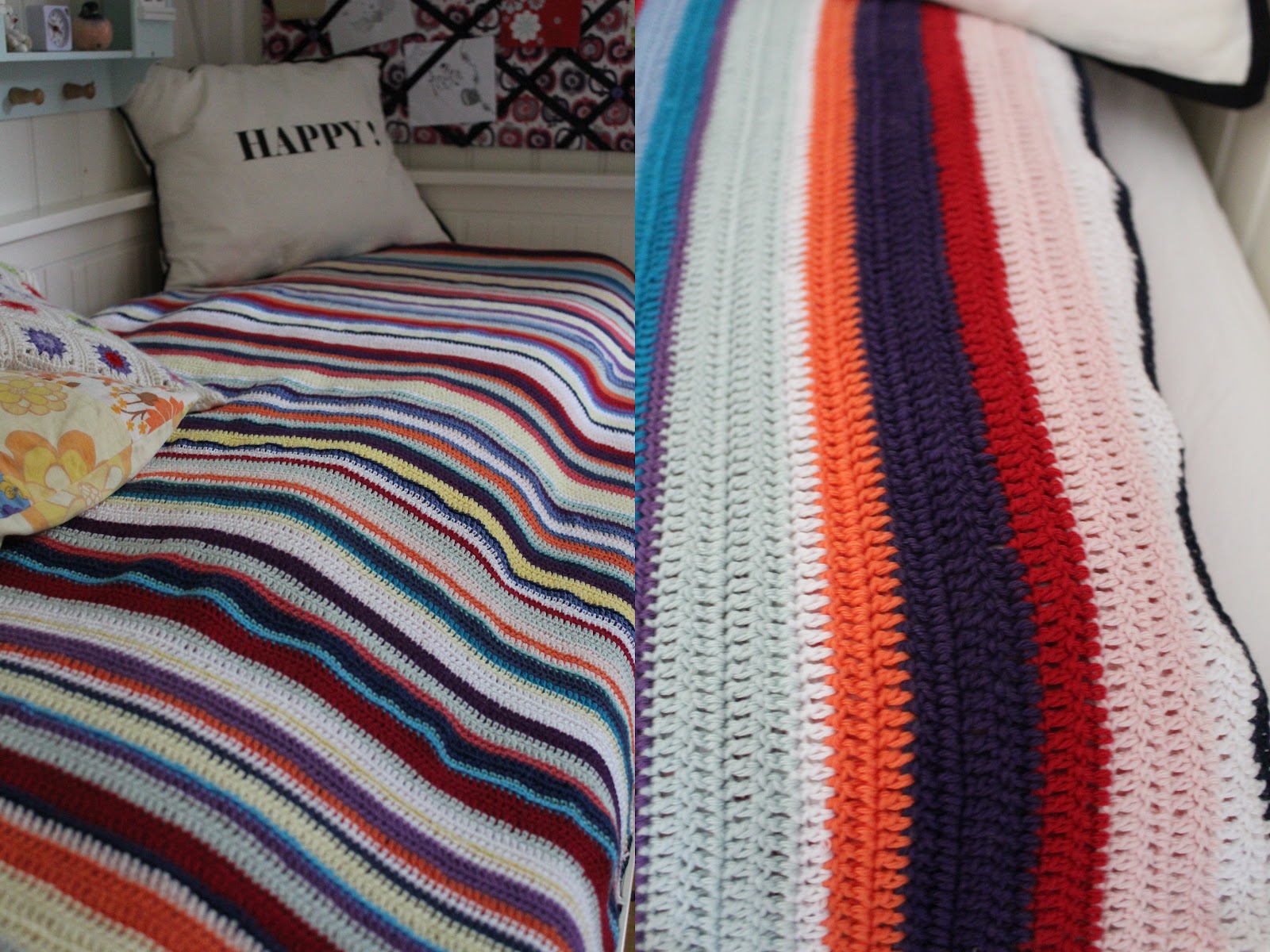 Jeg trodde det kom til å bli dønn kjedelig å hekle bare striper, men fargene gjorde det GØY å hekle faktisk. Har vel heklet noen rader hver kveld mesteparten av sommeren. Kanten rundt består av to omganger med fastmasker - fantastisk måte å slippe unna festing av endetråder på, som nå ligger inni kanten.
